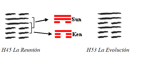 Las tres líneas blandas que le corresponden al trigrama inferior de la Tierra son las que se dejan conducir, porque este hexagrama me está diciendo que, para poder reunir o religar mis partes o formar parte de un grupo de un grupo social de un o espiritual y evolucionar (por el nuclear), adentro, internamente necesito apertura, docilidad y hacia fuera serenidad.